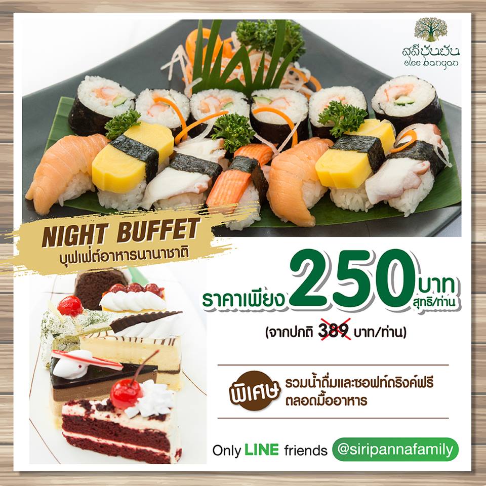 ข่าวดี!! สำหรับผู้ที่ชอบทานอาหารนานาชาติ กับโปรโมชั่น สุดคุ้ม! บุฟเฟ่ต์อาหารนานาชาติ Night Buffet ที่ห้องอาหารสลีบันยัน พิเศษสำหรับคนที่เป็นเพื่อนใน Line @siripannafamily รับไปเลย Line coupon ราคาเพียงท่านละ 250 บาทสุทธิ จากปกติ 389 บาท ตั้งแต่วันนี้ ถึง 31 พฤษภาคม 2560 เท่านั้น