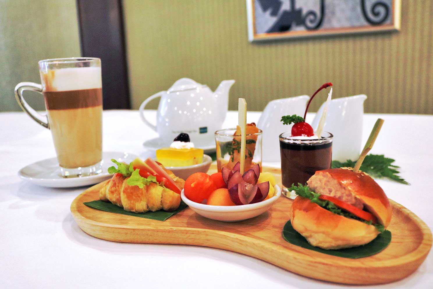 ไฮย์ ที เซ็ท 2 สำหรับ 2 ท่าน เสิร์ฟชาร้อน/เย็น หรือกาแฟ อร่อยคู่กับปอเปี๊ยะผักทอด สูตรพิเศษ รังสรรค์มาโดยเฉพาะ, ครัวซองต์แฮมชีส, สลัดทูน่ามินิเบอร์เกอร์, เค้กส้ม, ช็อคโกแลตมูส และผลไม้รวม 1 ชุด ราคาชุดละ 220 บาทสุทธิ