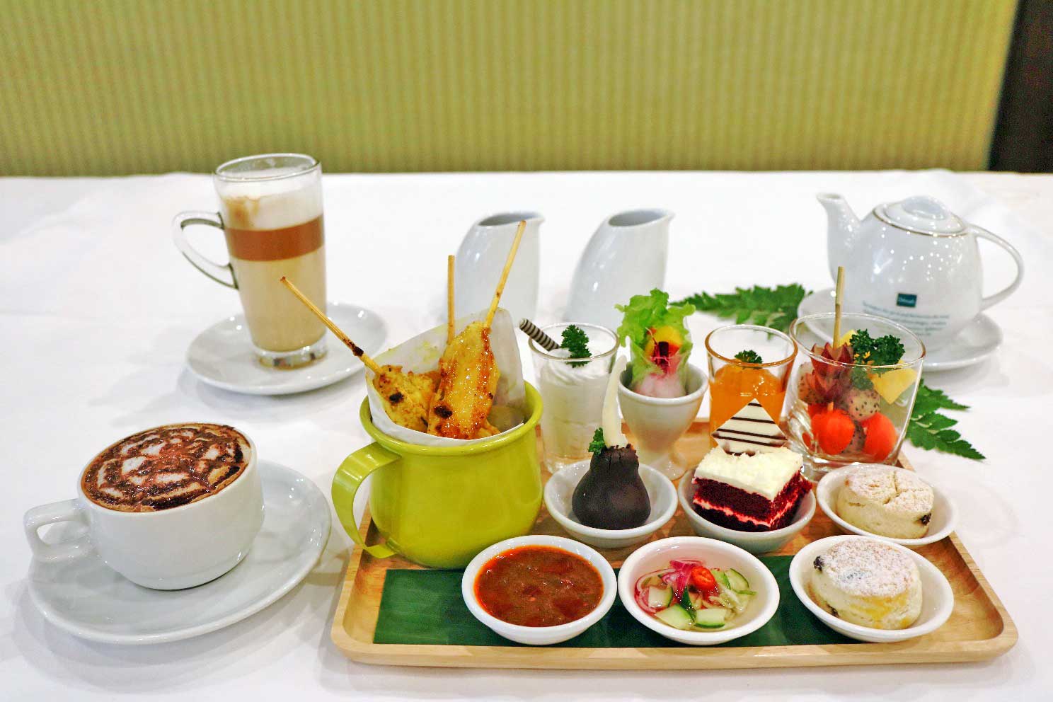 ไฮย์ ที เซ็ท 3 สำหรับ 3 ท่าน เสิร์ฟชาร้อน/เย็น หรือกาแฟ อร่อยคู่กับ ไก่สะเต๊ะ เมนูอร่อยที่เชฟสร้างสรรค์ขึ้นมาใหม่ เพื่อให้เข้ากับบรรยากาศของการจิบชายามบ่าย, สลัดเรนโบว์ เมนูประยุกต์ปรับเปลี่ยนส่วนผสม เพื่อเสริมรสชาติ , สโคน เมนูขนมหวานที่เชฟบรรจงสร้างสรรค์รสชาติที่อร่อย หอม นุ่มลิ้น มาเอาใจคนรักสโคนโดยเฉพาะ, เรดเวลเวตเค้ก, ช็อคโกแลตรัมบอล เนื้อนุ่มละมุน และผลไม้รวม 1 ชุด ราคาชุดละ 280 บาทสุทธิ